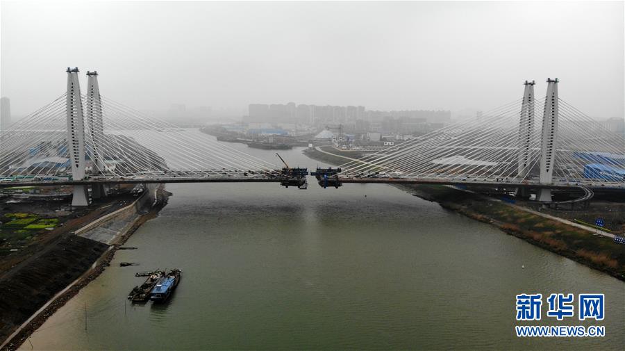 这是3月10日拍摄的跨裕溪河大桥施工现场(无人机照片)。 近日,安徽省巢湖市重点工程——亚父路跨裕溪河大桥建设工程有序复工。工作人员在做好疫情防控的同时,保障工程有序推进。 据了解,跨裕溪河大桥距离合龙仅剩15米,预计今年5月初实现主桥合龙,7月中旬建成通车。 新华社发(黄博涵 摄)