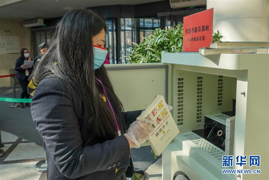 3月11日,长春市图书馆工作人员用杀菌设备为归还的图书消毒杀菌。 当日,根据长春市复工复产的相关安排,长春市图书馆进入复工开馆初级阶段。图书馆实施读者限时限流预约进馆制度,读者需配戴口罩从图书馆主楼正门进入,并接受两次体温测量。 新华社记者 张楠 摄