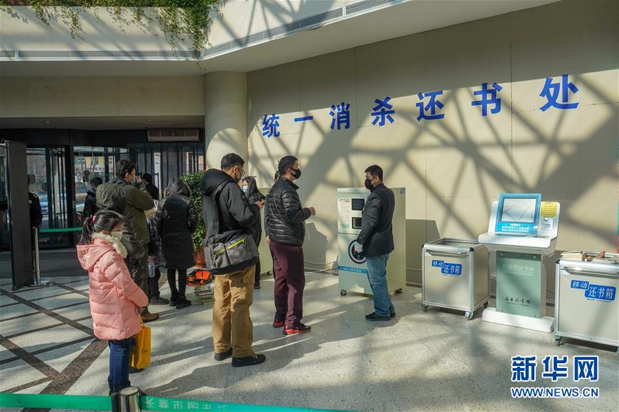 3月11日,市民在长春市图书馆内排队,给归还的图书消毒杀菌。 当日,根据长春市复工复产的相关安排,长春市图书馆进入复工开馆初级阶段。图书馆实施读者限时限流预约进馆制度,读者需配戴口罩从图书馆主楼正门进入,并接受两次体温测量。 新华社记者 张楠 摄