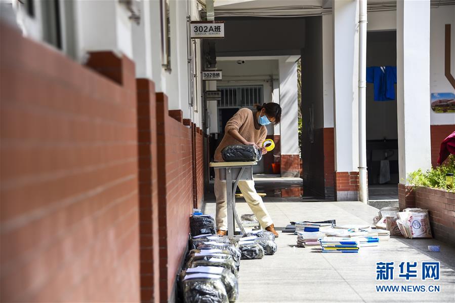 孝感一中老师把整理好的学习资料打包(3月10日摄)。 新华社记者 胡虎虎 摄