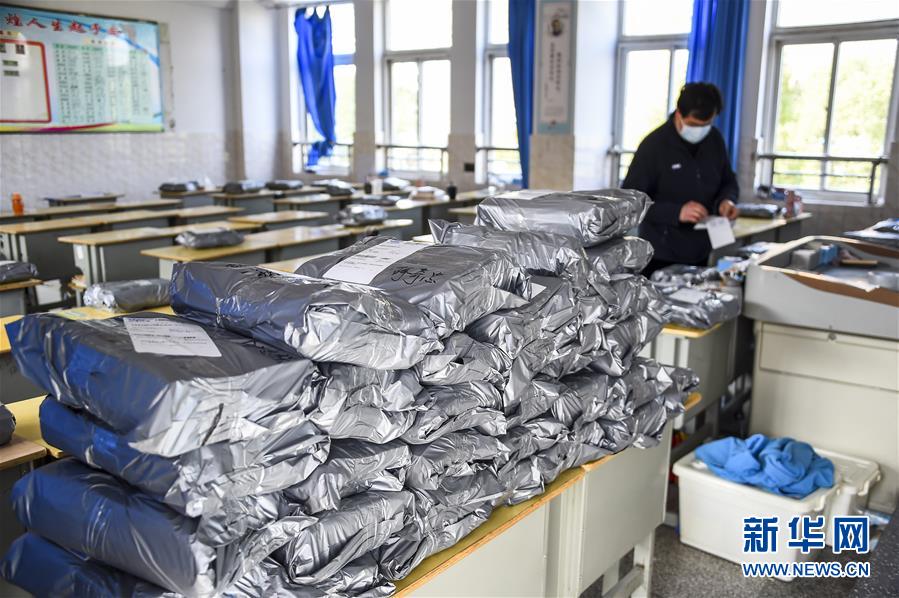 孝感一中的老师在学习资料包上贴快递信息单(3月10日摄)。 新华社记者 胡虎虎 摄