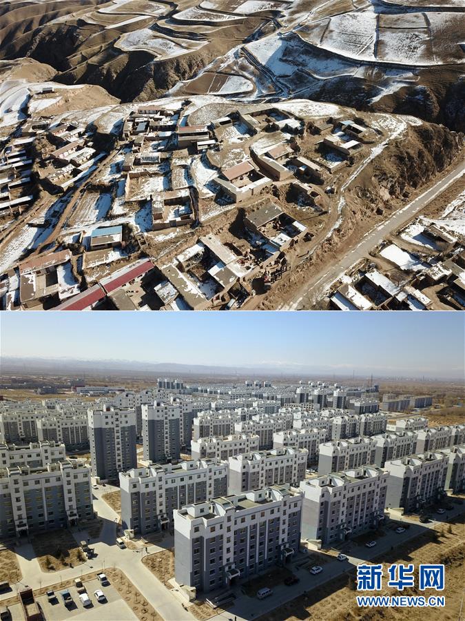 这是一张拼版照片。上图为2018年2月6日拍摄的古浪县黄羊川镇石城村原貌(无人机照片);下图为3月10日拍摄的石城村群众易地扶贫搬迁入住的古浪县黄花滩生态移民区绿洲生态移民小镇(无人机照片)。