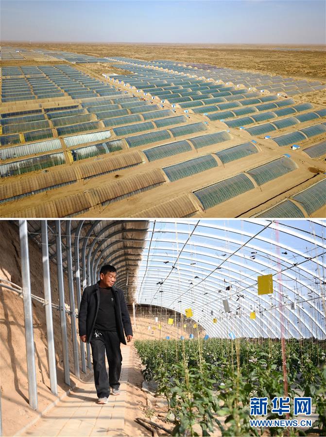 这是一张拼版照片。上图为3月5日拍摄的古浪县黄花滩生态移民区五道沟万亩戈壁农业示范点(无人机照片);下图为3月5日拍摄的古浪县黄花滩生态移民区五道沟万亩戈壁农业示范点大棚内景象。 新华社记者 范培珅 摄