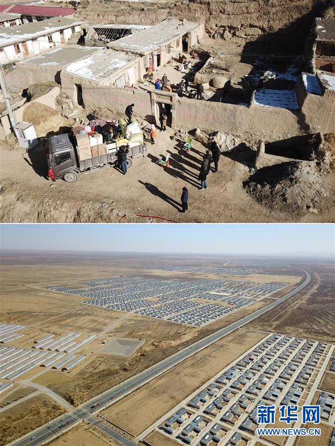 这是一张拼版照片。上图为2018年2月6日拍摄的古浪县黄羊川镇石城村原貌(无人机照片);下图为3月10日拍摄的古浪县黄花滩生态移民区(无人机照片)。 新华社记者 范培珅 摄