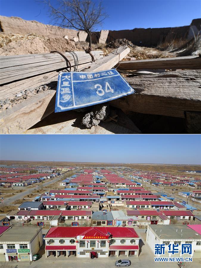 这是一张拼版照片。上图为2017年2月18日拍摄的古浪县十八里堡乡中团村旧貌;下图为3月10日拍摄的中团村群众易地扶贫搬迁入住的古浪县黄花滩生态移民区感恩新村(无人机照片)。 新华社记者 范培珅 摄
