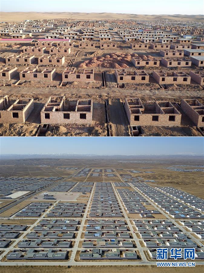 这是一张拼版照片。上图为2017年2月18日拍摄的古浪县黄花滩生态移民区一处在建安置点(无人机照片);下图为3月10日拍摄的古浪县黄花滩生态移民区一处安置点(无人机照片)。 新华社记者 范培珅 摄