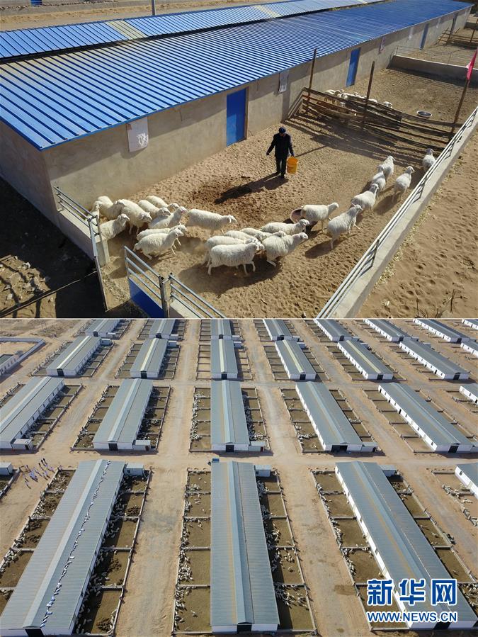 这是一张拼版照片。上图为3月10日拍摄的古浪县黄花滩生态移民区富民新村李应川家的养殖圈舍;下图为3月5日拍摄的古浪县黄花滩生态移民区的一处种羊繁育基地(无人机照片)。养殖是黄花滩生态移民区群众增收致富的重要产业。 新华社记者 范培珅 摄