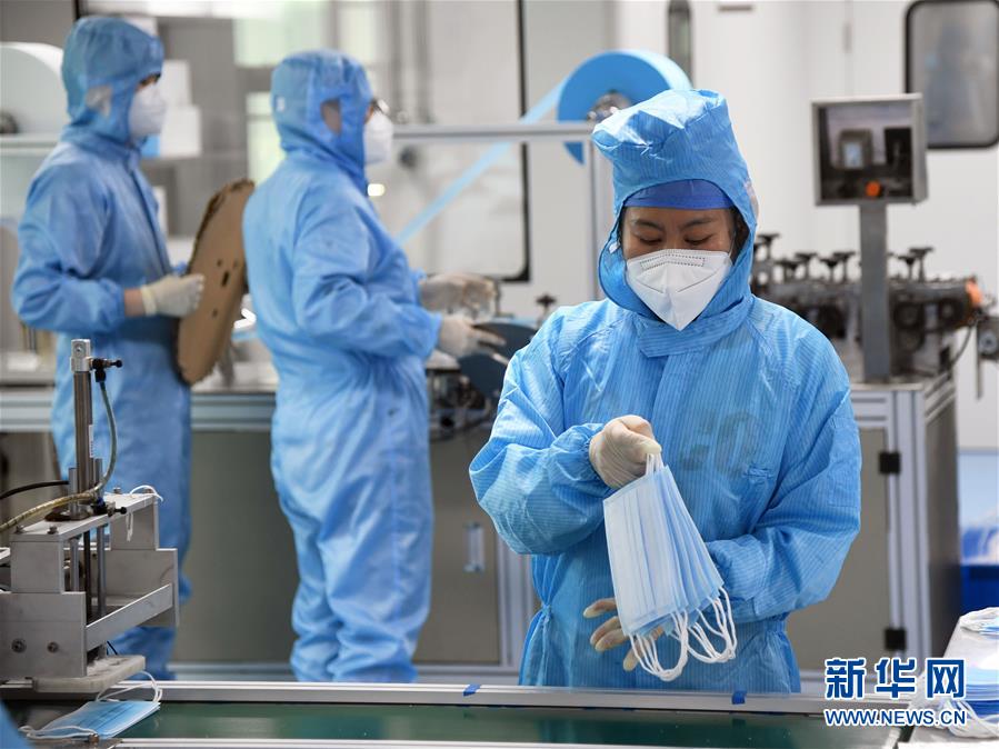 3月11日,在医用外科口罩生产车间,工作人员(右一)对口罩进行过程检验。 纳通生物科技(北京)有限公司是一家主要从事骨科植入物研发、生产和销售的企业。公司经相关部门评估和快速审批,新增口罩生产线,在严格落实疫情防控措施的前提下,全力生产口罩,助力疫情防控。 新华社记者 任超 摄