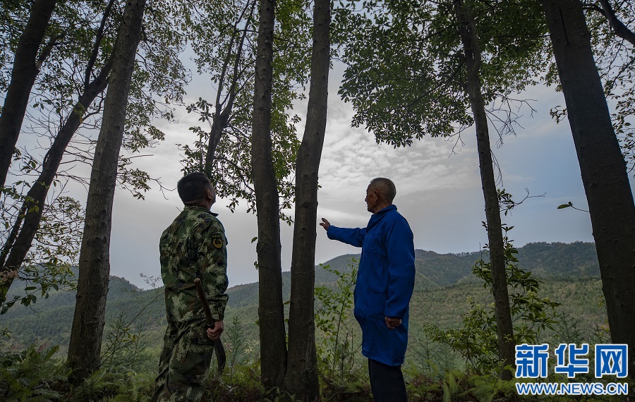 曹洪忠触摸一棵棵老树,言语极少却是心情舒畅无比,这是他60多年前参加工作后经常踏足的地方。图为曹洪忠(右一)正在给曹小华(左一)讲述过往护林故事。