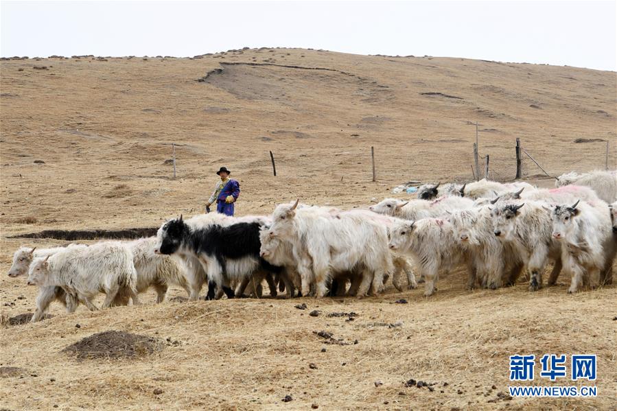 3月12日,在天祝藏族自治县抓喜秀龙镇南泥沟村,宋天柱准备将白牦牛从草原赶回圈舍。 新华社记者 范培珅 摄