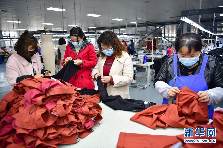 3月11日,在城固县博望街道办事处江湾社区一服装厂内,工人在检查服装产品。