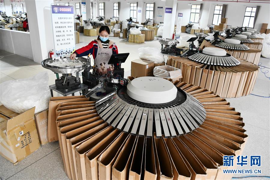 3月12日,在锦屏经济开发区贵州亚狮龙体育文化产业发展有限公司羽毛球生产基地,工人利用机器分选制作羽毛球所需的羽毛。新华社记者 杨文斌 摄