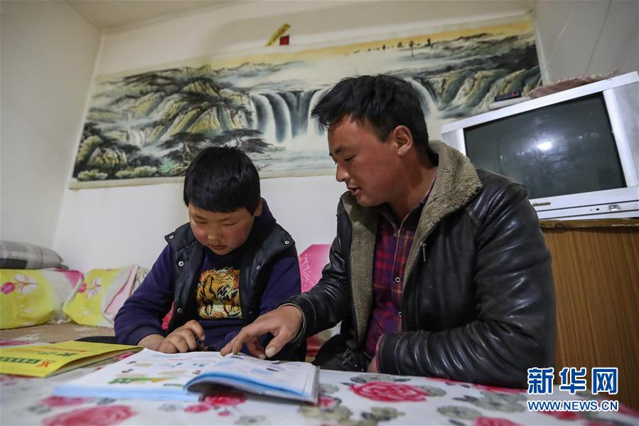 3月12日,在渭源县元古堆村易地扶贫搬迁集中安置点,路彦荣(右)督促儿子写作业。新华社发(马希平 摄)