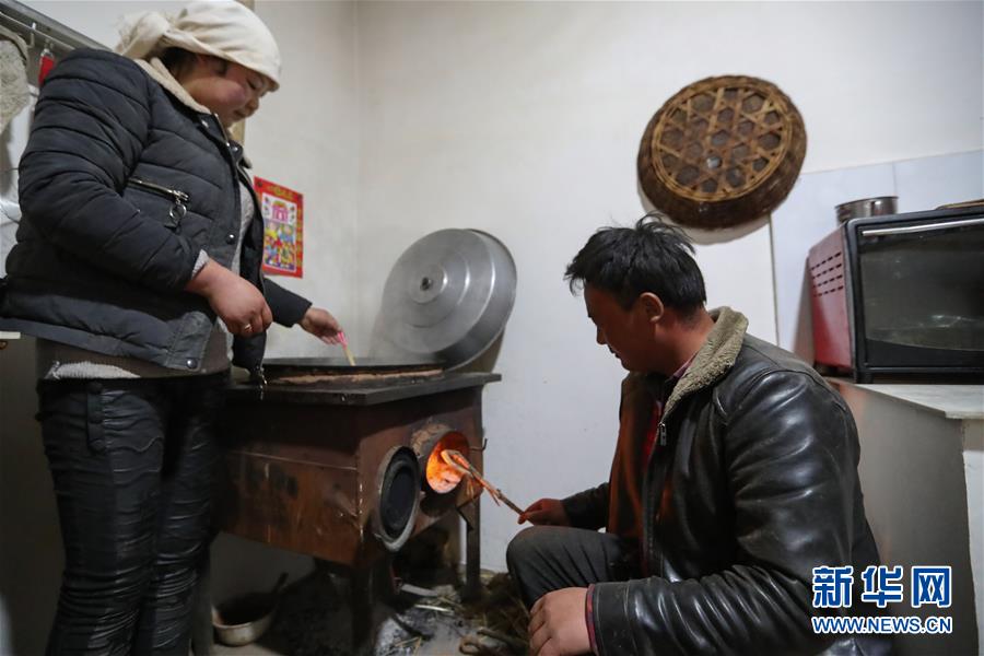 3月12日,在渭源县元古堆村易地扶贫搬迁集中安置点,路彦荣(右)和妻子一起做饭。新华社发(马希平 摄)