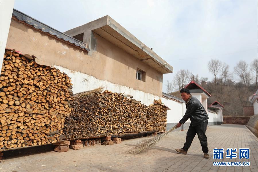 3月11日,在渭源县元古堆村易地扶贫搬迁集中安置点,路彦荣清扫新家门口的小道。新华社发(马希平 摄)