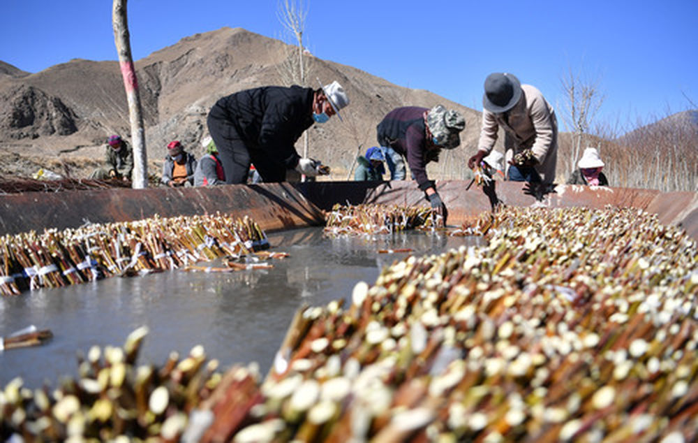 山南市桑日县绒乡程巴村村民在苗圃进行扦插苗泡水作业(3月11日摄)。 新华社记者 晋美多吉 摄