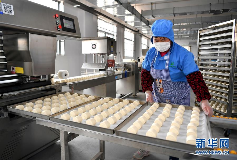 在铜川市耀州区小丘镇裕泽食品加工扶贫工厂内,工人在加工食品(3月12日摄)。新华社记者 刘潇 摄
