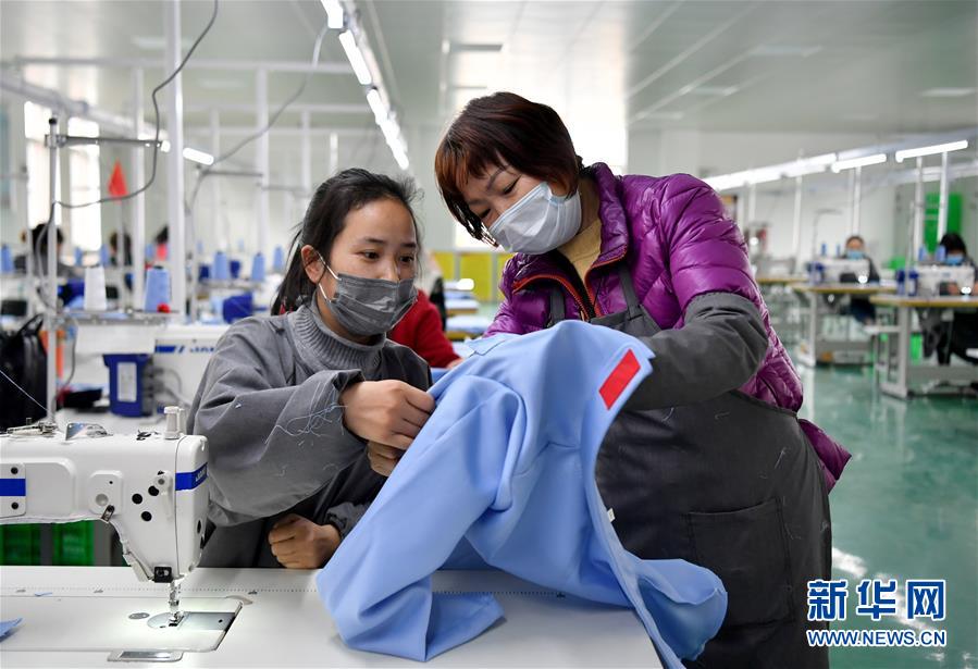在位于铜川市耀州区照金镇圣源小区的社区工厂内,工人在加工景区用服装(3月12日摄)。 新华社记者 刘潇 摄