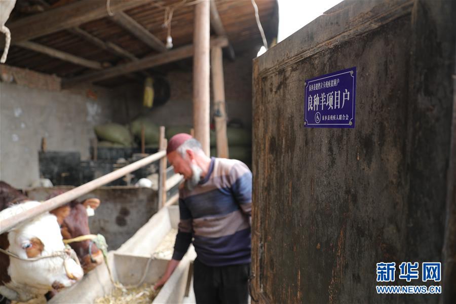 3月12日,在甘肃省临夏回族自治州东乡族自治县凤山乡陈二甲村,村民马木洒在自家新修建的棚圈内喂牛羊。这些棚圈按统一标准修建在每一户村民新房的后院内。新华社发(杜哲宇 摄)