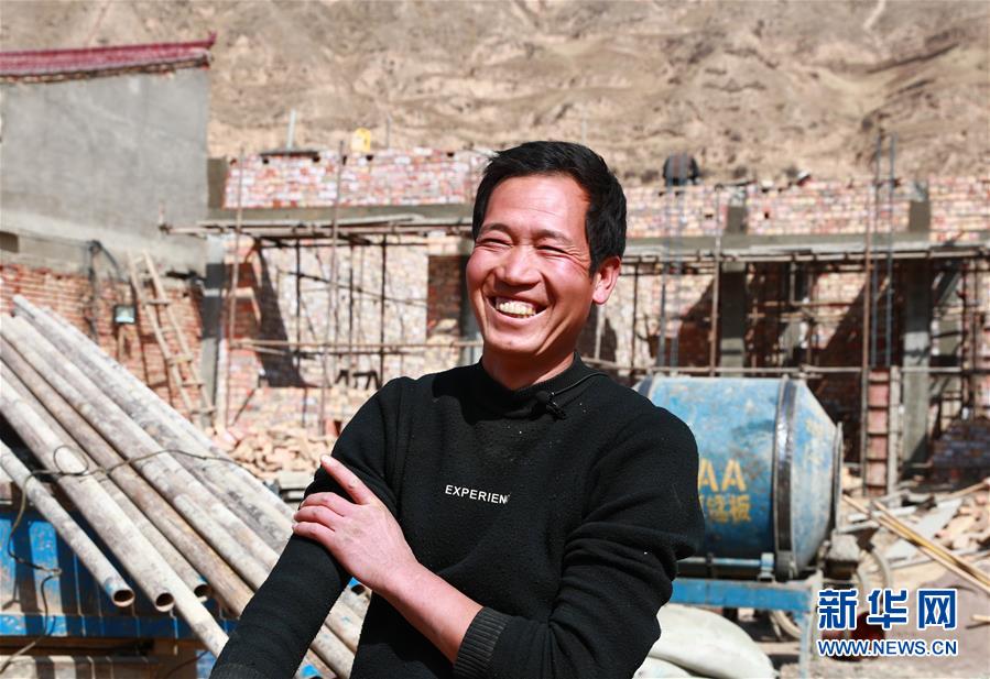 3月12日,在甘肃省临夏回族自治州东乡族自治县凤山乡上沟村,村民在自家新房的工地前喜笑颜开。新华社发(杜哲宇 摄)