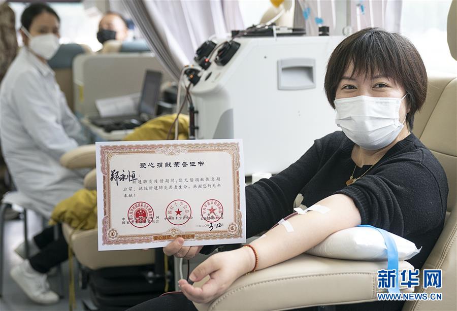 3月12日,郑永恒在捐献血浆的过程中展示荣誉证书。 3月12日,郑永恒和84位病友离开武汉软件工程职业学院康复驿站,回到自己家中。他们都是治愈出院的新冠肺炎患者,已经在武汉软件工程职业学院康复驿站进行了14天医学观察,达到医学标准,成功解除隔离。他们由专车运送至所属社区附近的集散点后,在社区工作人员的陪同下回家。 刚解除隔离,郑永恒就和两名病友来到医院,捐献恢复期血浆,希望能帮助到依然在与病毒做斗争的人们。 新华社记者 熊琦 摄