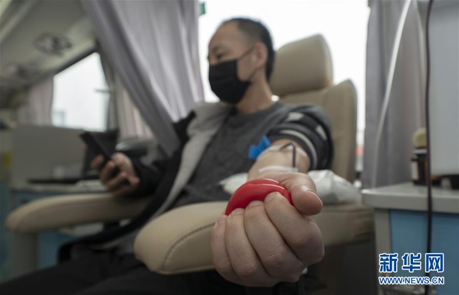 3月12日,在位于中国人民解放军中部战区总医院的献血车里,陈志在献血。 3月12日,陈志和84位病友离开武汉软件工程职业学院康复驿站,回到自己家中。他们都是治愈出院后的新冠肺炎患者,已经在武汉软件工程职业学院康复驿站进行了14天医学观察,达到医学标准,成功解除隔离。他们由专车运送至所属社区附近的集散点后,在社区工作人员的陪同下回家。 从出现新冠肺炎症状住院到离开康复驿站,陈志已经有一个多月没有回家。他非常想念自己的家人,尤其是女儿。然而,在回家之前,陈志还要去做“一件最重要的事,而且是第一时间必须做的——献血!” 刚刚住进康复驿站没两天时,陈志就和住在自己隔壁宿舍的两位病友一起约好,解除隔离之后的第一件事,就是到医院献血,希望能帮助到依然在与病毒做斗争的人们。 新华社记者 费茂华 摄