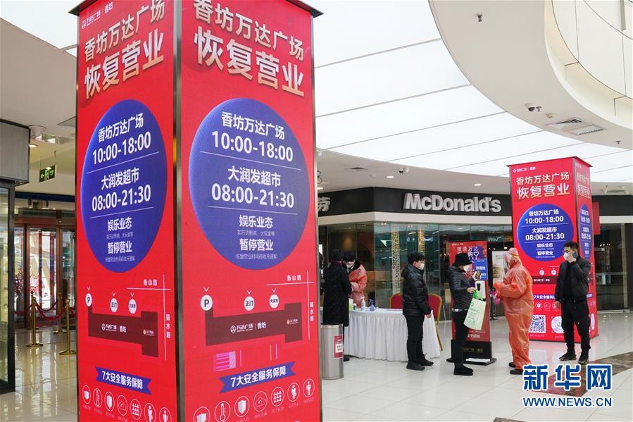 3月13日,在哈尔滨香坊万达广场内,工作人员在给进店顾客测体温、消毒。 近日,哈尔滨市多家大型商场陆续恢复营业。这些恢复营业的商场采取多种措施,从严细致做好疫情防控和安全风险防范工作,为广大顾客提供安全放心的购物空间。 新华社记者 王建威 摄