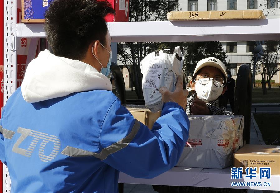 3月12日,李杰(左)在中国青年政治学院快递点隔着栅栏给客户递送包裹。 新华社记者 张玉薇 摄