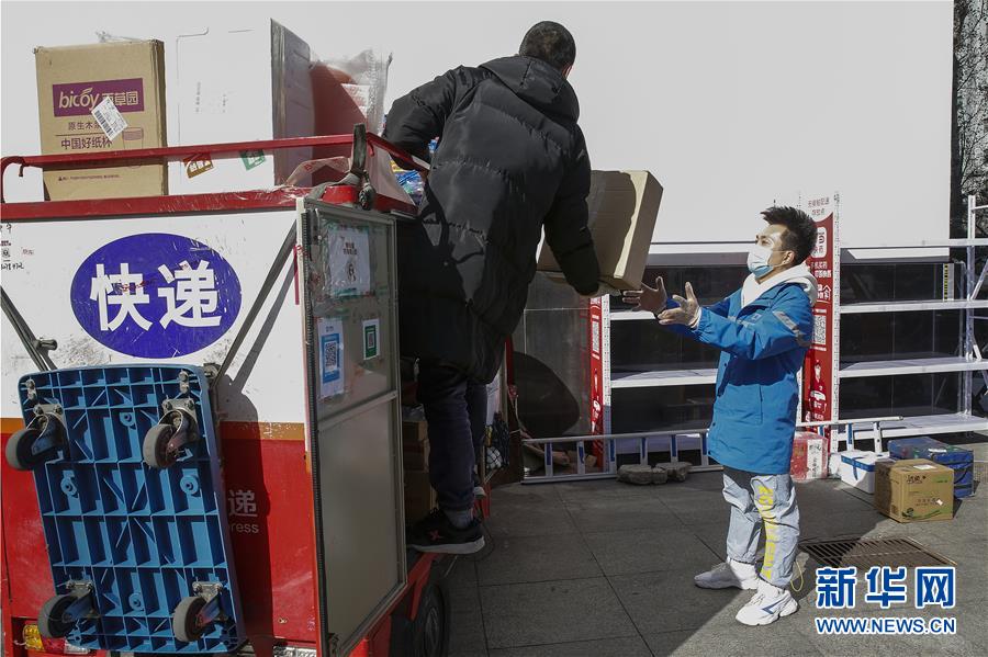 3月12日,李杰(右)在中国青年政治学院快递点帮助其他公司同行卸货。新华社记者 张玉薇 摄