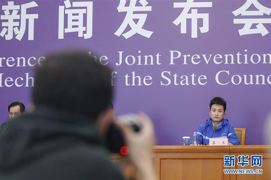 3月9日,中通快递北京厂洼路网点快递员李杰在北京出席国务院联防联控机制新闻发布会。 新华社记者 张玉薇 摄
