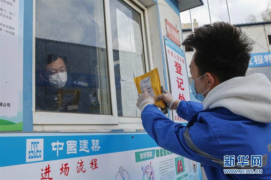 3月12日,李杰(右)在一个投递点向传达室工作人员询问收件人的信息。新华社记者 张玉薇 摄