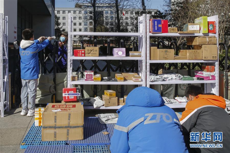 3月12日,李杰(左一)在中国青年政治学院快递点隔着栅栏给客户递送包裹。 新华社记者 张玉薇 摄