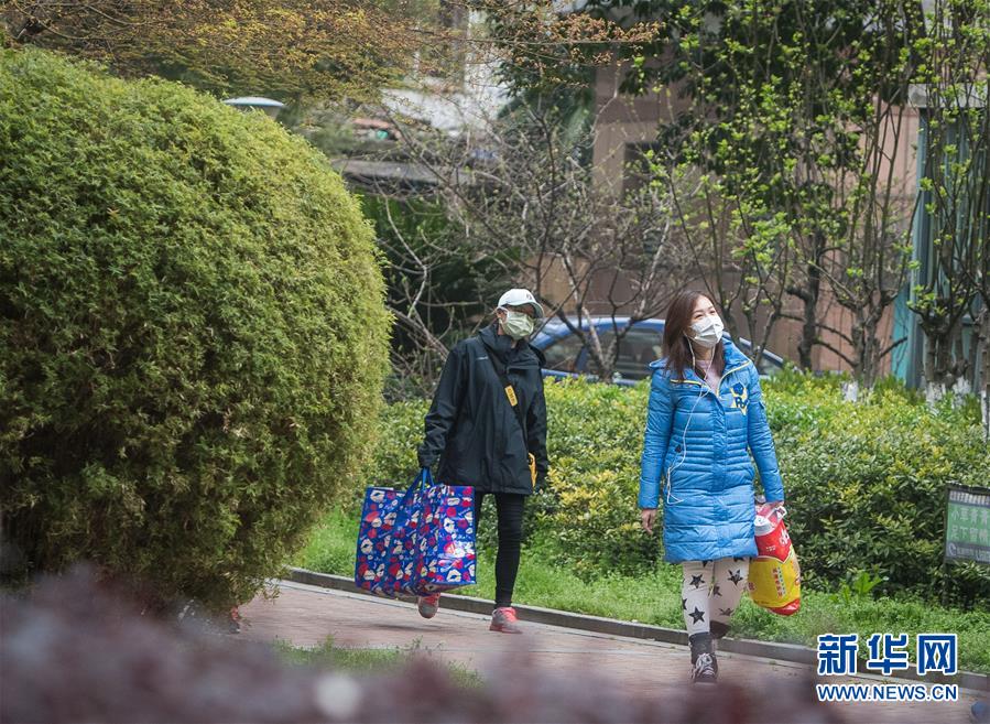 3月12日,小区树叶绿了,黎婧(右)与网格员走在回家路上。 3月12日,插画师黎婧和84位病友离开自己居住的武汉软件工程职业学院康复驿站,回到自己家中。他们都是治愈出院的新冠病毒肺炎患者,已经在武汉软件工程职业学院康复驿站进行了14天医学观察,达到医学标准,成功解除隔离。他们由专车运送至所属社区附近的集散点后,在社区工作人员的陪同下回家。 新华社记者 肖艺九 摄