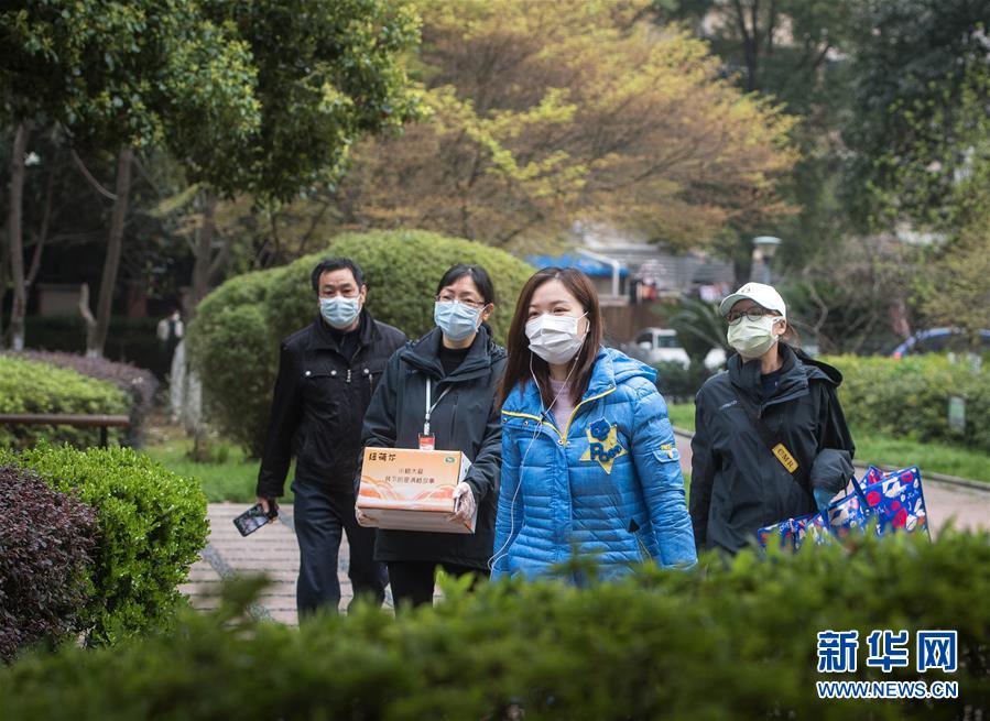 3月12日,小区树叶绿了,黎婧(右二)与网格员走在回家路上。 3月12日,插画师黎婧和84位病友离开自己居住的武汉软件工程职业学院康复驿站,回到自己家中。他们都是治愈出院的新冠病毒肺炎患者,已经在武汉软件工程职业学院康复驿站进行了14天医学观察,达到医学标准,成功解除隔离。他们由专车运送至所属社区附近的集散点后,在社区工作人员的陪同下回家。 新华社记者 肖艺九 摄