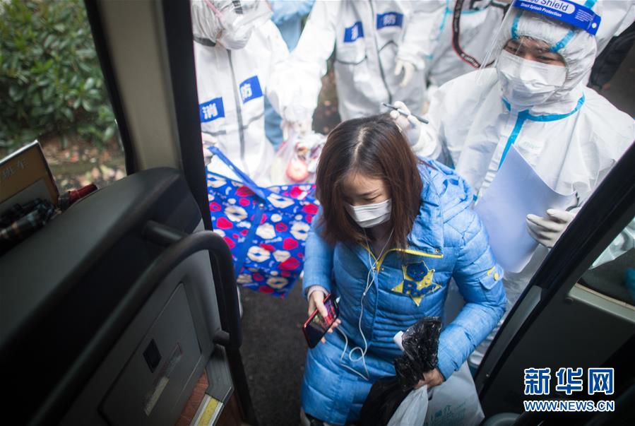 3月12日,黎婧(前)在志愿者的陪护下登上大巴。 3月12日,插画师黎婧和84位病友离开自己居住的武汉软件工程职业学院康复驿站,回到自己家中。他们都是治愈出院的新冠病毒肺炎患者,已经在武汉软件工程职业学院康复驿站进行了14天医学观察,达到医学标准,成功解除隔离。他们由专车运送至所属社区附近的集散点后,在社区工作人员的陪同下回家。 新华社记者 肖艺九 摄