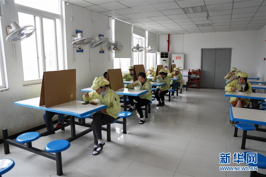 3月13日,重庆培铭光电科技有限公司职工在就餐区用餐。 近日,重庆市北碚区积极对接已复业并具备集体用餐配送资质的餐饮单位,为有用餐需求的企业提供餐饮集体配送服务,助推企业安全有序复工复产。 新华社发(黄伟 摄)