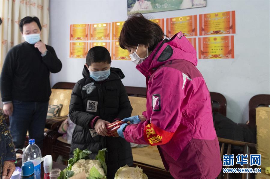 3月15日,刘晓琳(右)给水星台社区居民送去蔬菜、火腿肠等食品。新华社发(谢剑飞 摄)