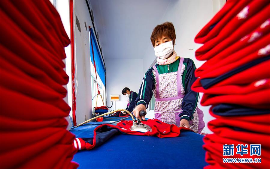 3月15日,武安市马家庄村村民在“扶贫微工厂”熨烫服装。 近日,河北省武安市在做好疫情防控的同时,积极组织“扶贫微工厂”有序复工复产。 新华社记者 王晓 摄