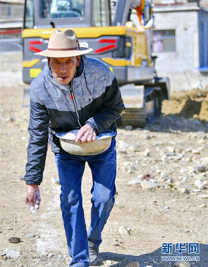 3月15日,恩惠苑社区的易地搬迁居民边巴在造林绿化施工现场用石灰粉标注施工标识。 当日,西藏拉萨市城关区蔡公堂街道恩惠苑社区造林绿化工程启动,年内将在蔡村五组嘎玛隆沟种植11万余株江孜沙棘,带动该社区700多户易地搬迁居民增加收入,并增强当地群众的绿色环保意识。 新华社记者 张汝锋 摄