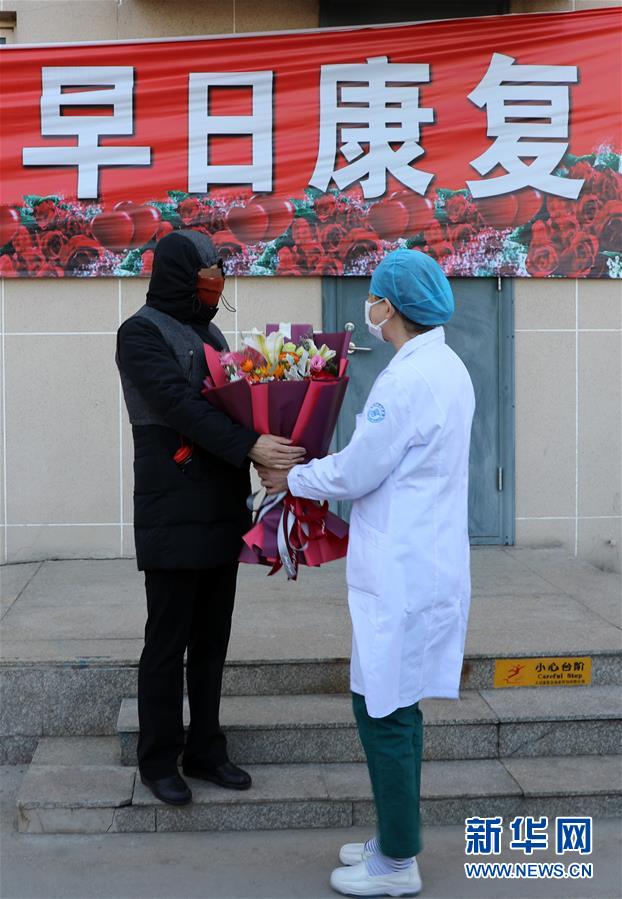 3月15日,在天津市海河医院,出院患者接过医护人员送上的鲜花。 当日,天津市现有新冠肺炎确诊病例中最后一位在院治疗患者从海河医院治愈出院。 新华社记者 邓浩然 摄