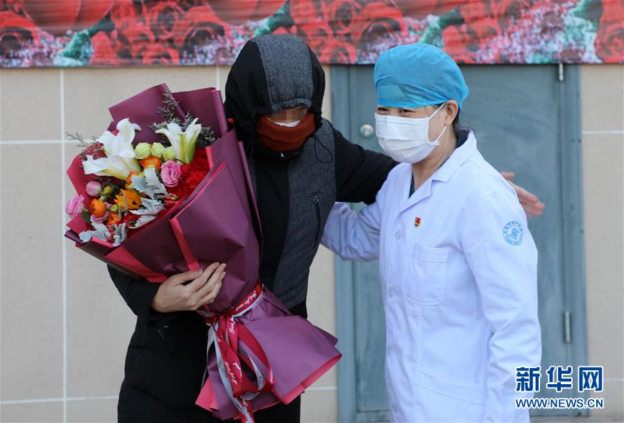 3月15日,在天津市海河医院,出院患者向医护人员表达感谢。 当日,天津市现有新冠肺炎确诊病例中最后一位在院治疗患者从海河医院治愈出院。 新华社记者 邓浩然 摄