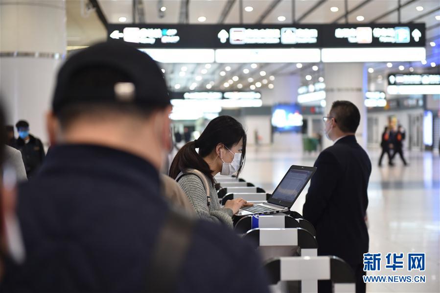 3月16日早,北京南站地铁站采取限流措施,一名乘客在排队等候分批进站时操作笔记本电脑。 新华社发(陈钟昊摄)