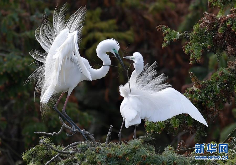 两只白鹭在筑巢(3月15日摄)。 随着气温回升,在江西省南昌市新建区象山森林公园内,大批迁徙而来的鹭鸟开始做窝筑巢。 新华社记者 彭昭之 摄