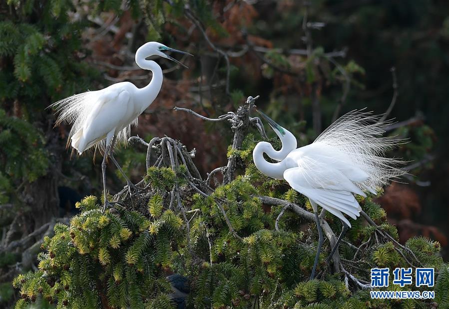 两只白鹭在林间嬉戏(3月15日摄)。 随着气温回升,在江西省南昌市新建区象山森林公园内,大批迁徙而来的鹭鸟开始做窝筑巢。 新华社记者 彭昭之 摄