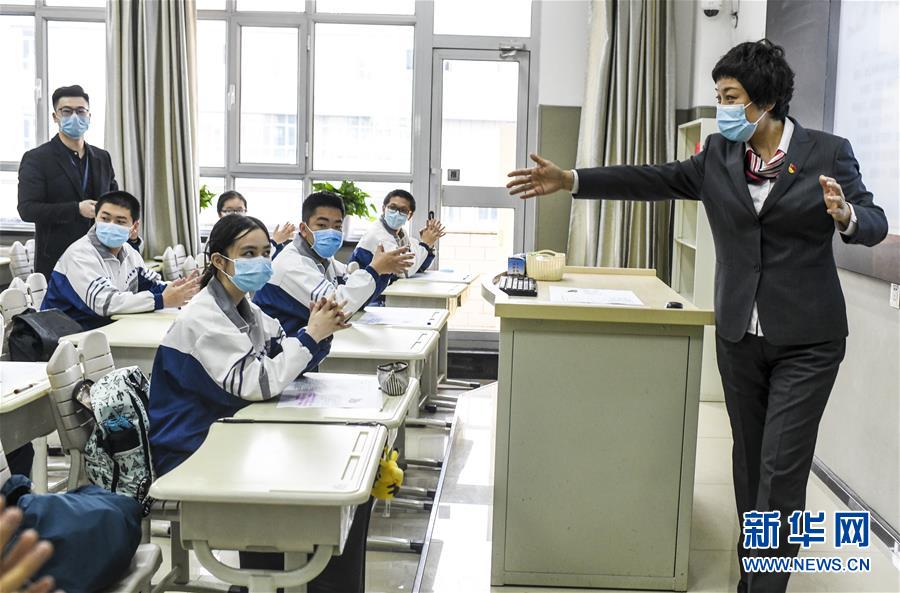 3月16日,在乌鲁木齐市第一中学,高三(16A)班老师和学生在开班会。新华社记者 王菲 摄