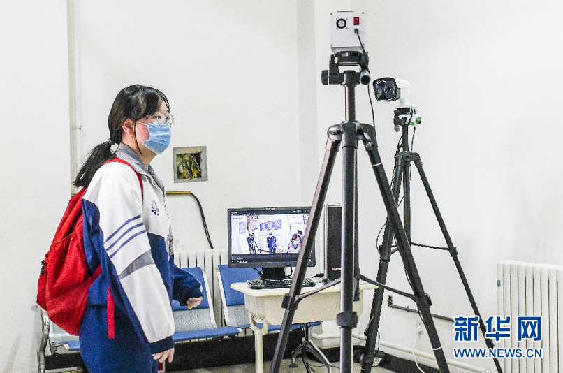 3月16日,在乌鲁木齐市第一中学,高三学生进入校门前接受体温监测。 新华社记者 王菲 摄