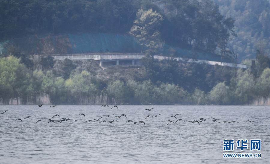 3月16日,一群鸳鸯在浙江省杭州市临安区的青山湖面上飞翔。 近期,随着春季气温逐渐回升,浙江省杭州市临安区的青山湖风景区内白鹭、鸳鸯、绿翅鸭、白枕鹤等各种野生鸟类聚集觅食。近年来,杭州市临安区积极落实河长制,以美丽河湖建设为依托,加强生态保护,着力营造青山湖“河畅水清、岸绿湖美”的鸟类栖息水生态环境。 新华社记者 徐昱 摄