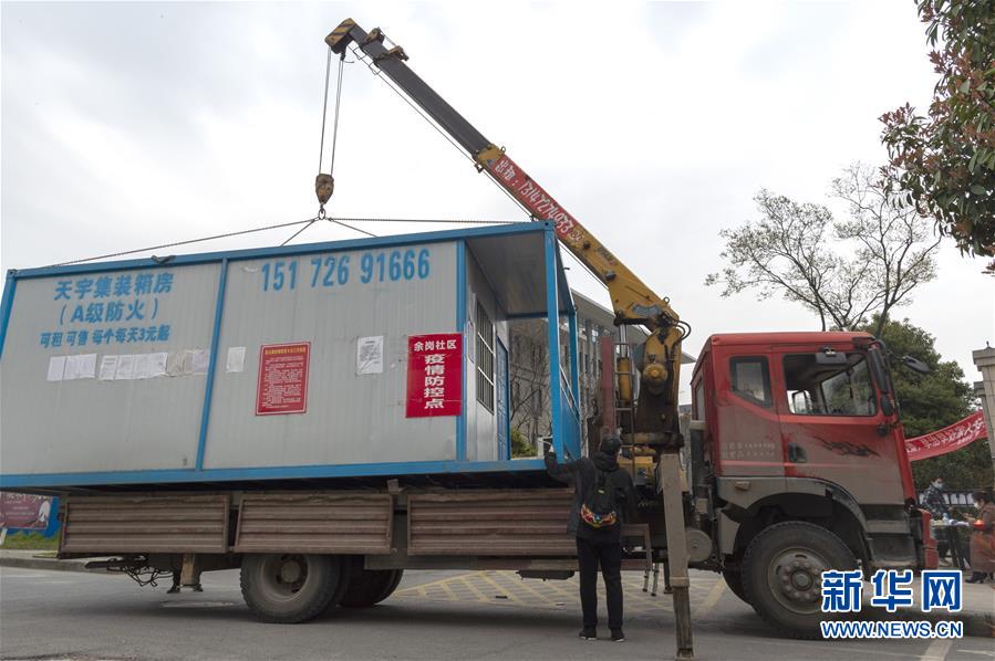 3月16日,在襄阳市余岗社区,工作人员将集装箱房从小区入口处吊离。 据了解,为统筹抓好疫情防控和企业复工复产、人员安全有序流动,推动经济发展等工作,从3月17日起,湖北省襄阳市部分疫情防控点将调整优化。 新华社发(谢剑飞 摄)
