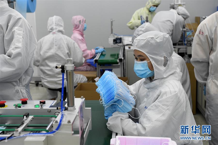 3月17日,工人在富士康口罩生产车间工作。 近日,记者走访深圳多家大型企业生产车间、粤港澳大湾区重点项目建设现场了解到,在抓好疫情防控的同时,深圳复工复产已进入“快车道”。截至目前,深圳全市规模以上工业企业、重点建设工程项目复工率均已超过97%。 新华社记者 梁旭 摄