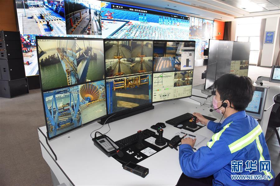 3月17日,青岛港集装箱码头工作人员在自动化无人码头中央控制室值守。 近日,山东港口集团各港区相关企业已全面恢复生产,船舶抵离港班次、集装箱吞吐量等均逐步回升,港口生产有序推进、积极向好。 新华社记者 李紫恒 摄